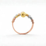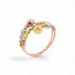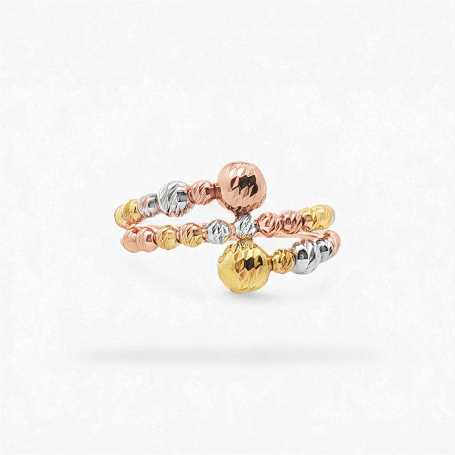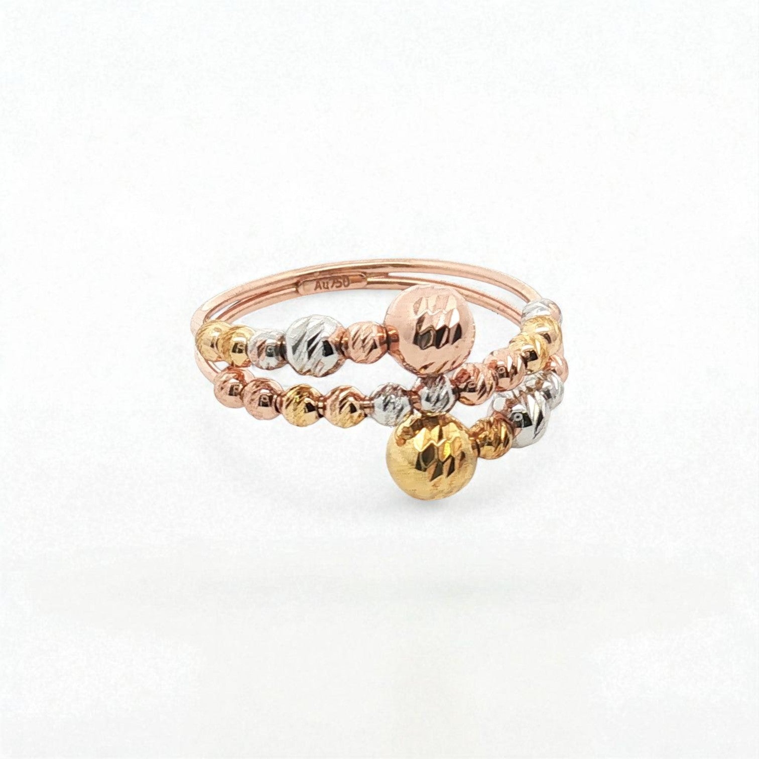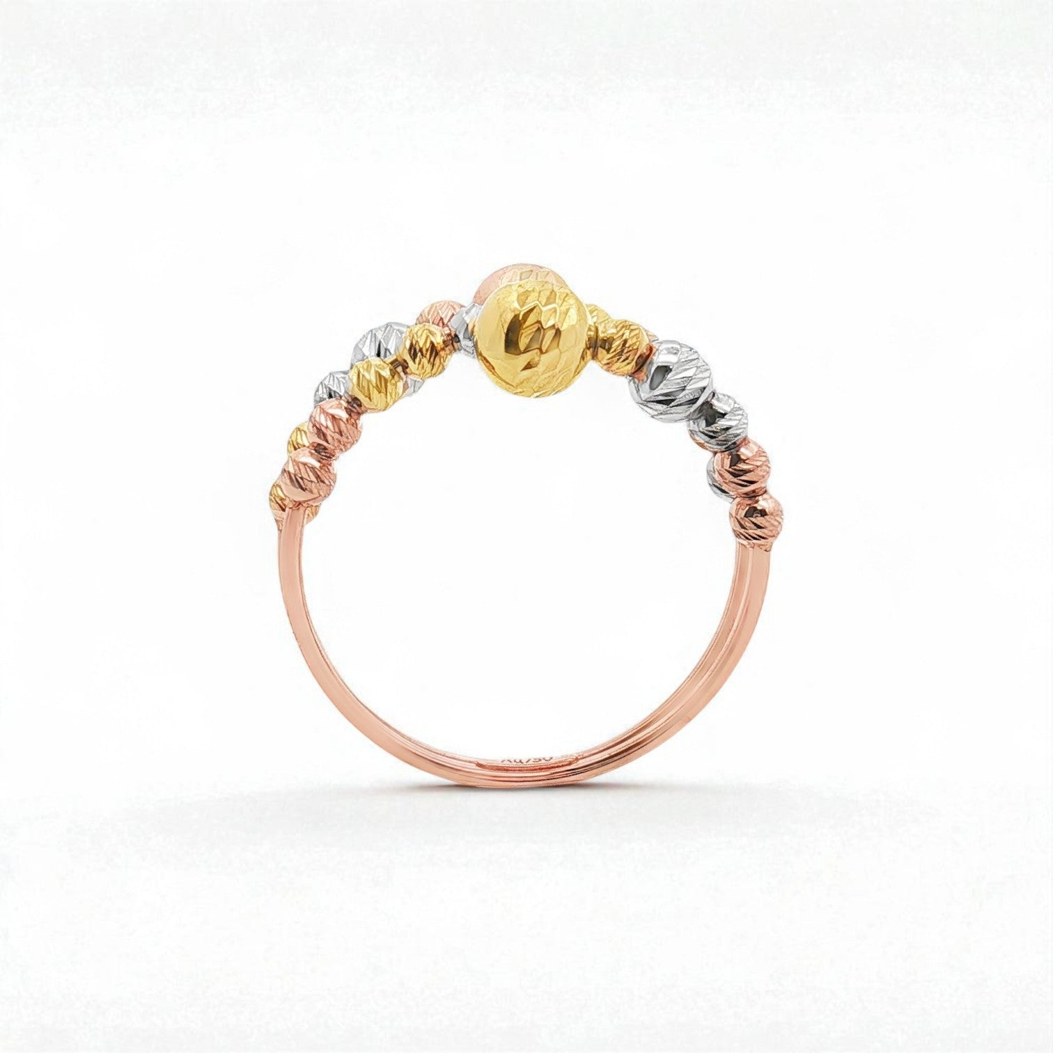 A playful yet elegant statement, this ring features a trio of polished 18K gold spheres — in white, rose, and yellow tones — symbolizing harmony in diversity.