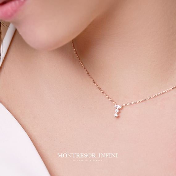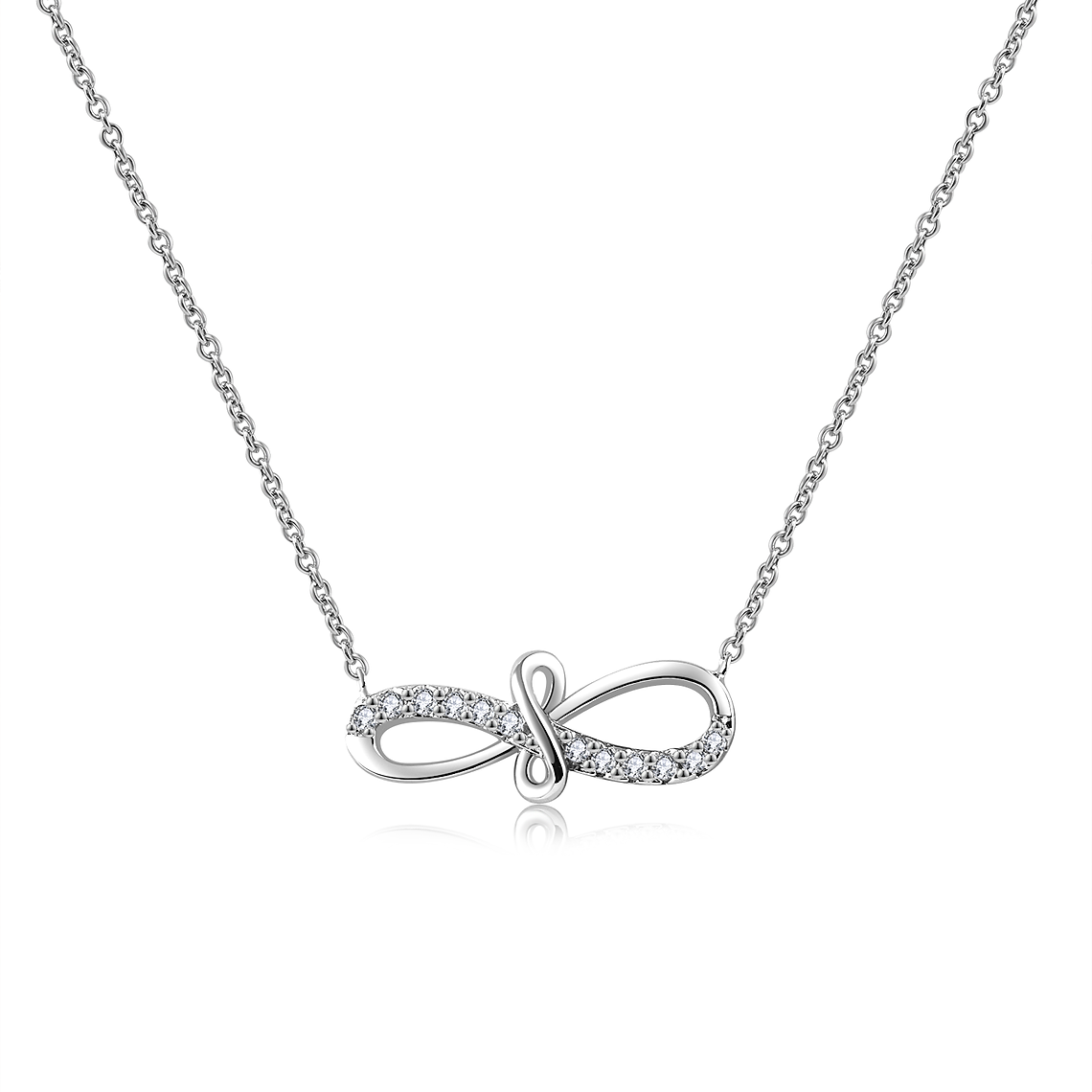 The necklace is designed in the shape of a ribbon, with sparkling zircons, and the chain is 16 inches long. The weight is 2.3g.